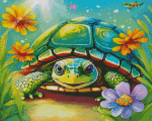 Green Turtle And Flowers Diamond Painting